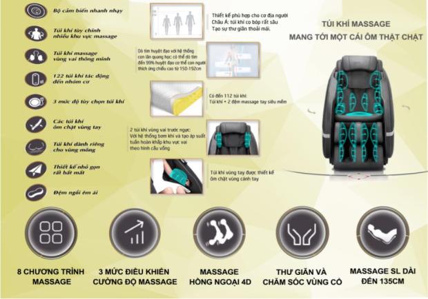 | Chức năng | 8 chương trình massage tự động toàn thân; tự động dò tìm huyệt đạo với hệ thống con lăn quang học; 112 túi khí với 3 mức độ tùy chọn thông minh tác động đến hầu hết các nhóm cơ trên cơ thể; hồng ngoại 4D; nâng dần và hạ dần tựa lưng, chân; massage bàn chân, xoa bóp từ ngoài vào trong, từ trong ra ngoài, vỗ, điều chỉnh lực xoa bóp và lực vỗ, massage khí nén cho bàn chân và mông. |